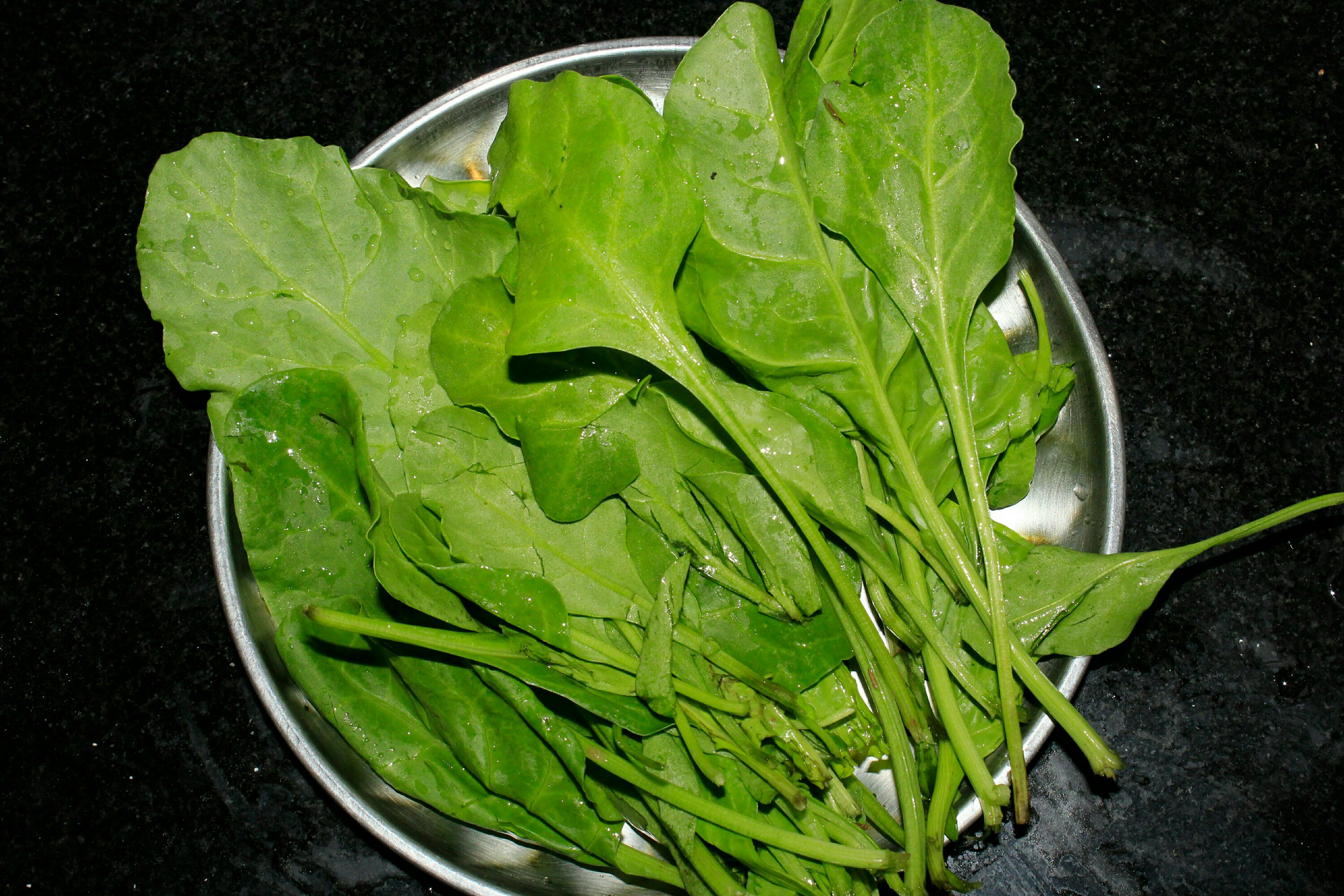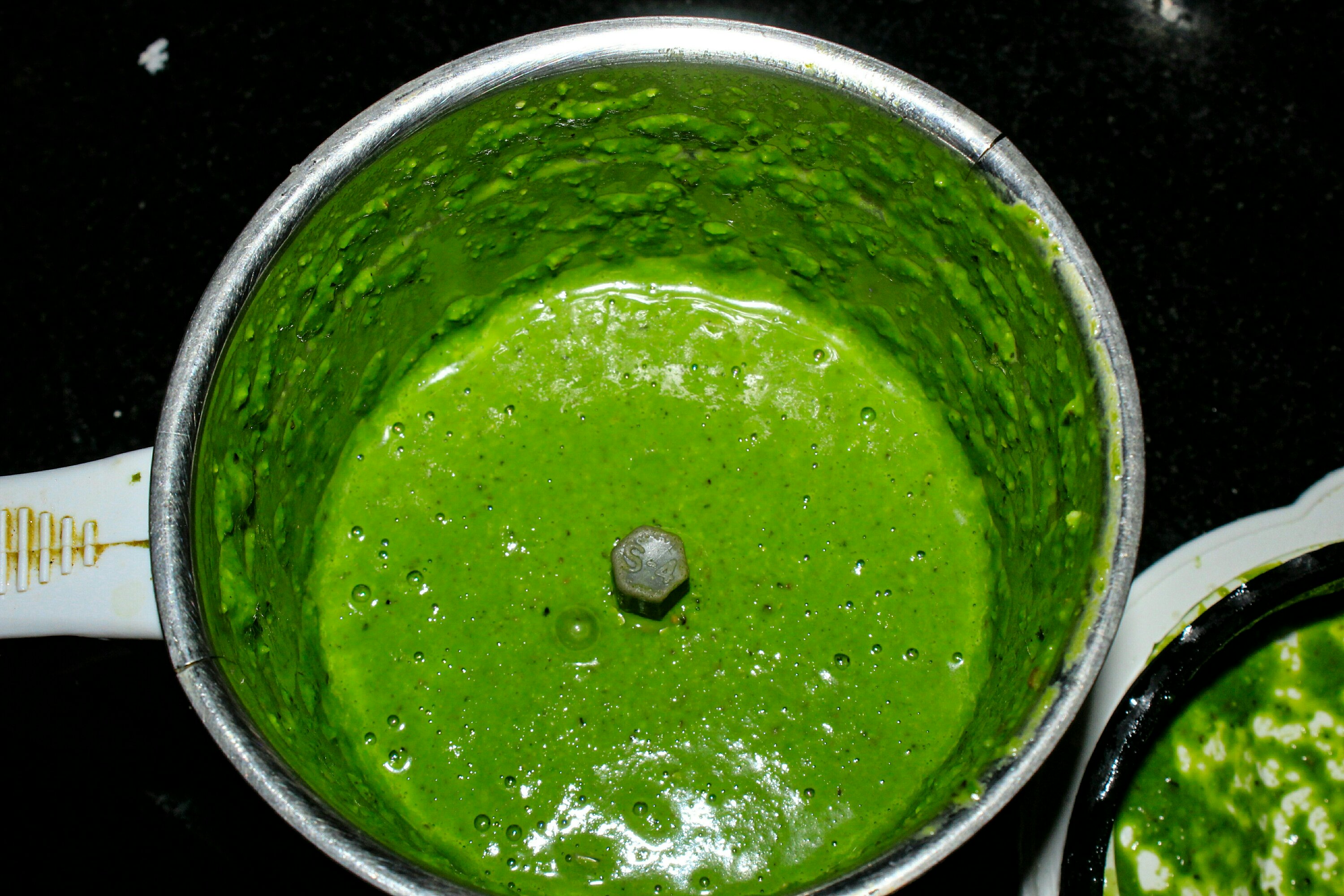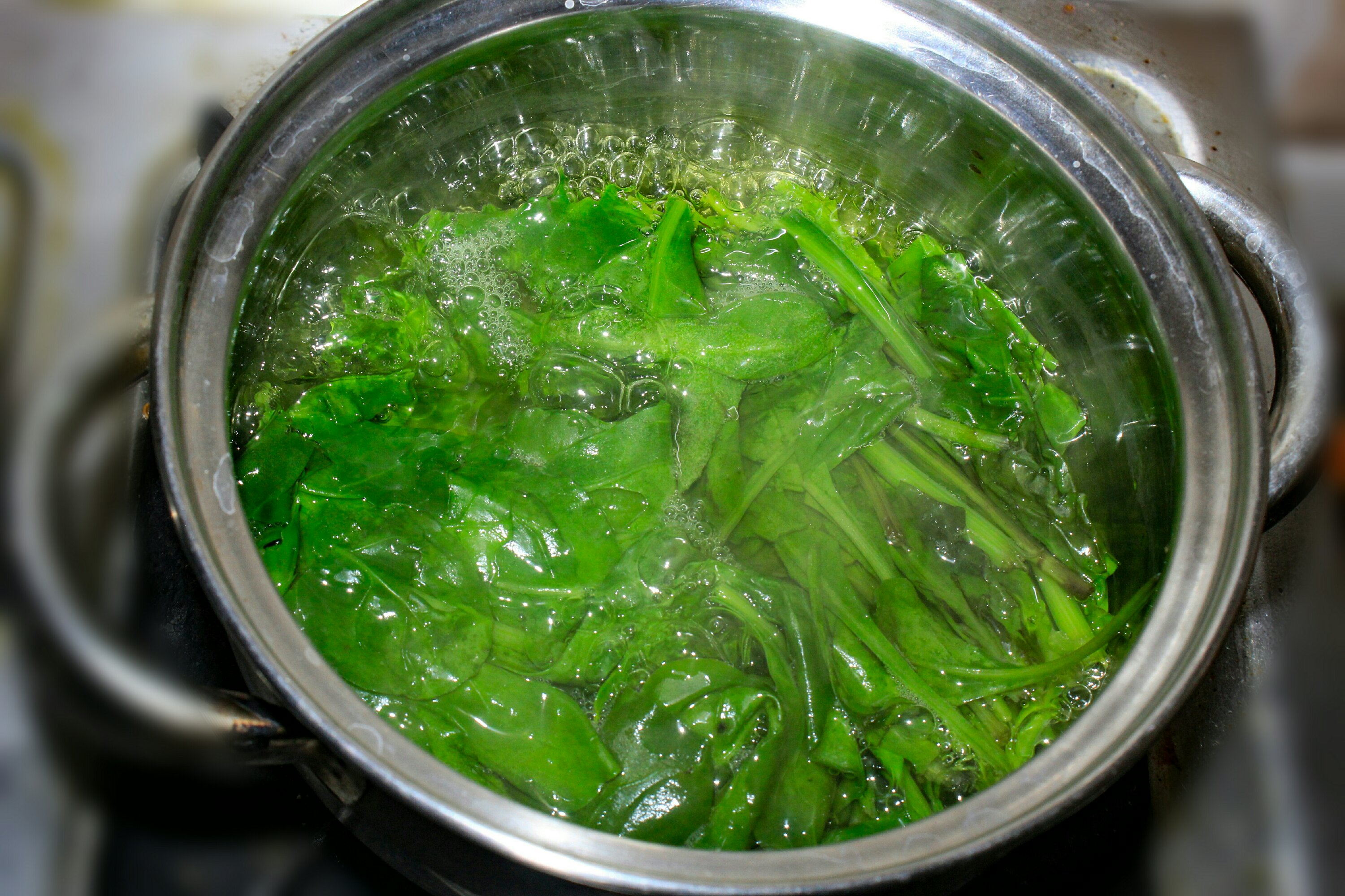 Put all the palak leaves after cleaning the leaves. start boiling the palak leaves in a 3 cup of water. the leaves need to turn green as showed in photo,Stop the stove when leave turns green