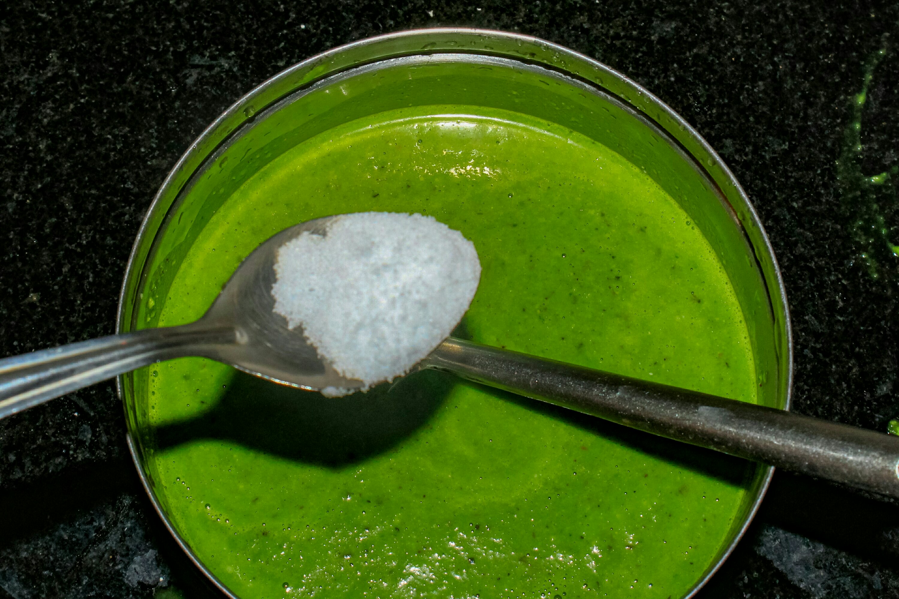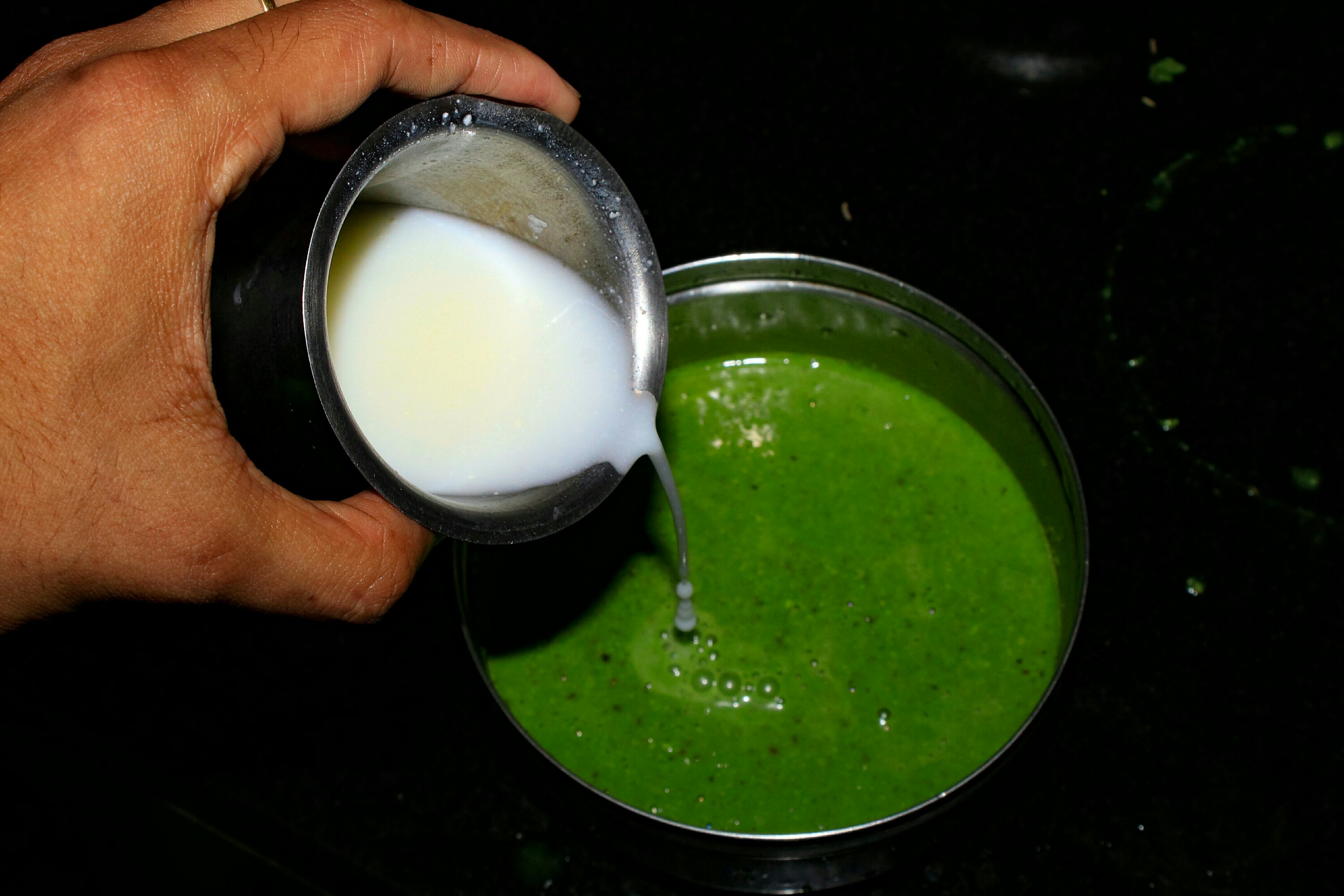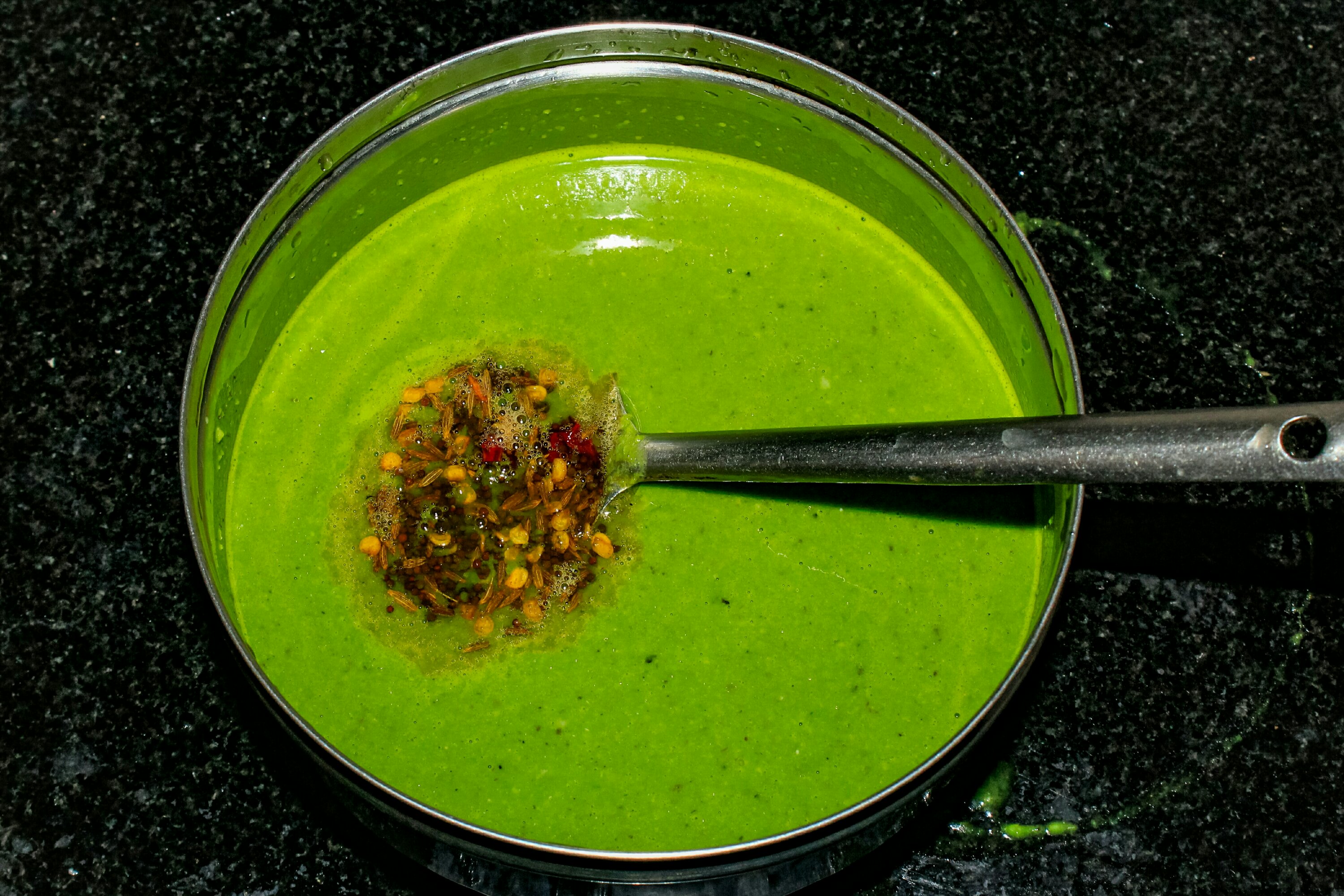 Put all the palak leaves after cleaning the leaves. start boiling the palak leaves in a 3 cup of water. the leaves need to turn green as showed in photo,Stop the stove when leave turns green