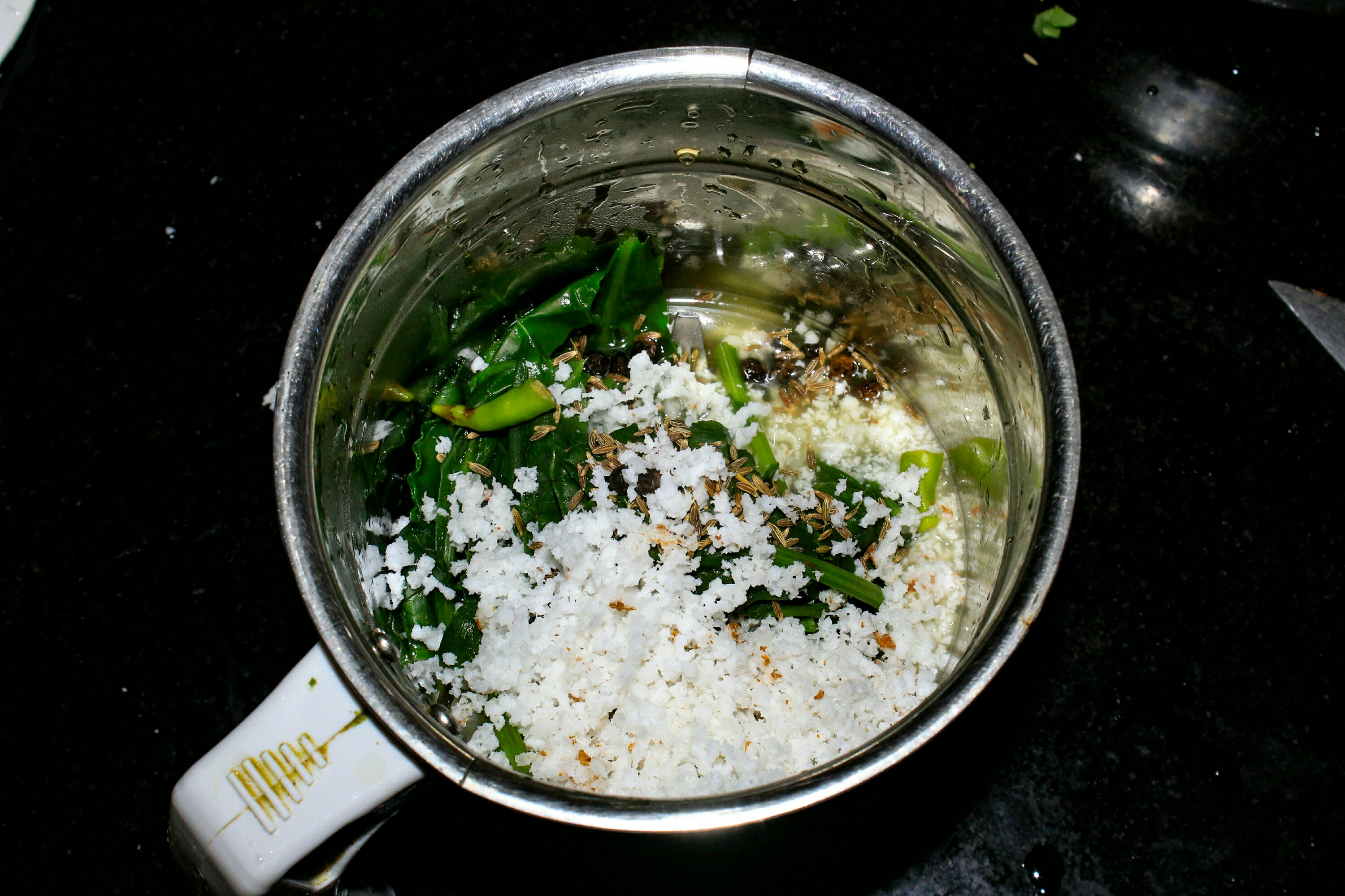 Now add these palak to the blender. also add grated coconut, half chilli if required, cumin seeds,black pepper. grind to fine paste adding minimum water.
